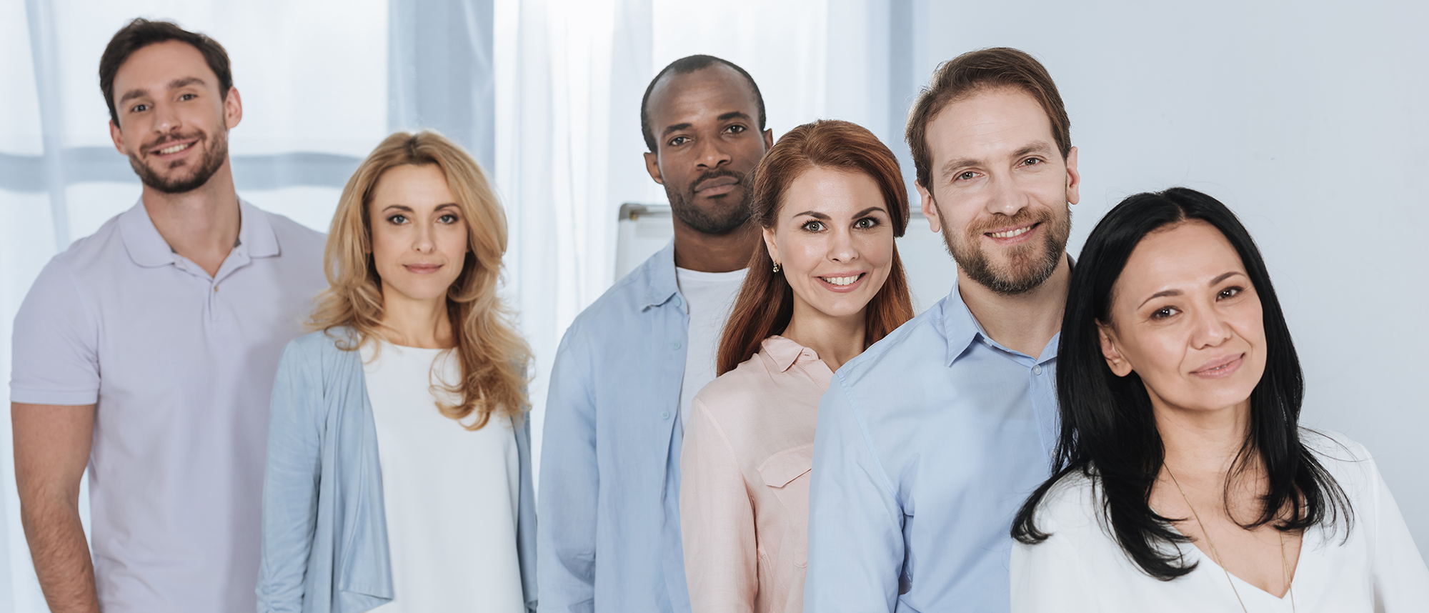 Group of adults, female and male of different ethnicities standing in a line facing forwards and smiling